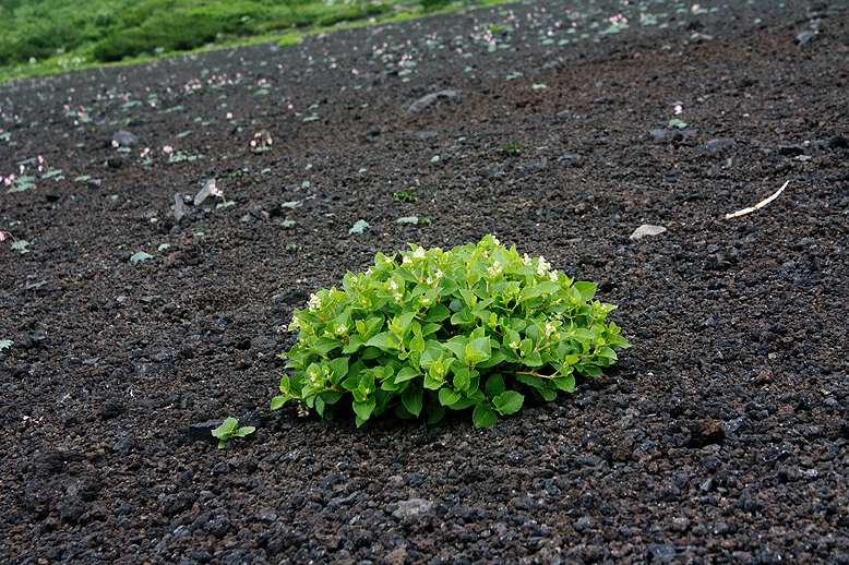 大焼砂の砂礫に、コマクサと一緒にポツポツと株が点在している。